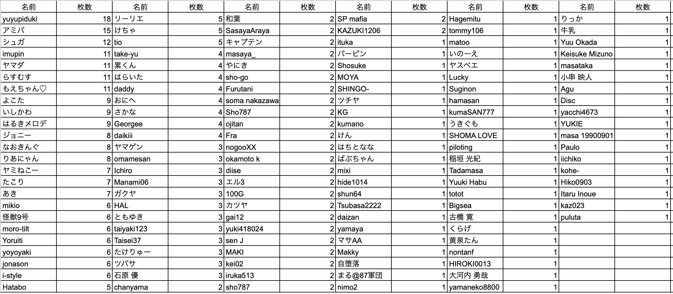 集計期間中にGameIDのニックネームを変更された方は、名前が2つに分かれてしまいますのでご了承ください。