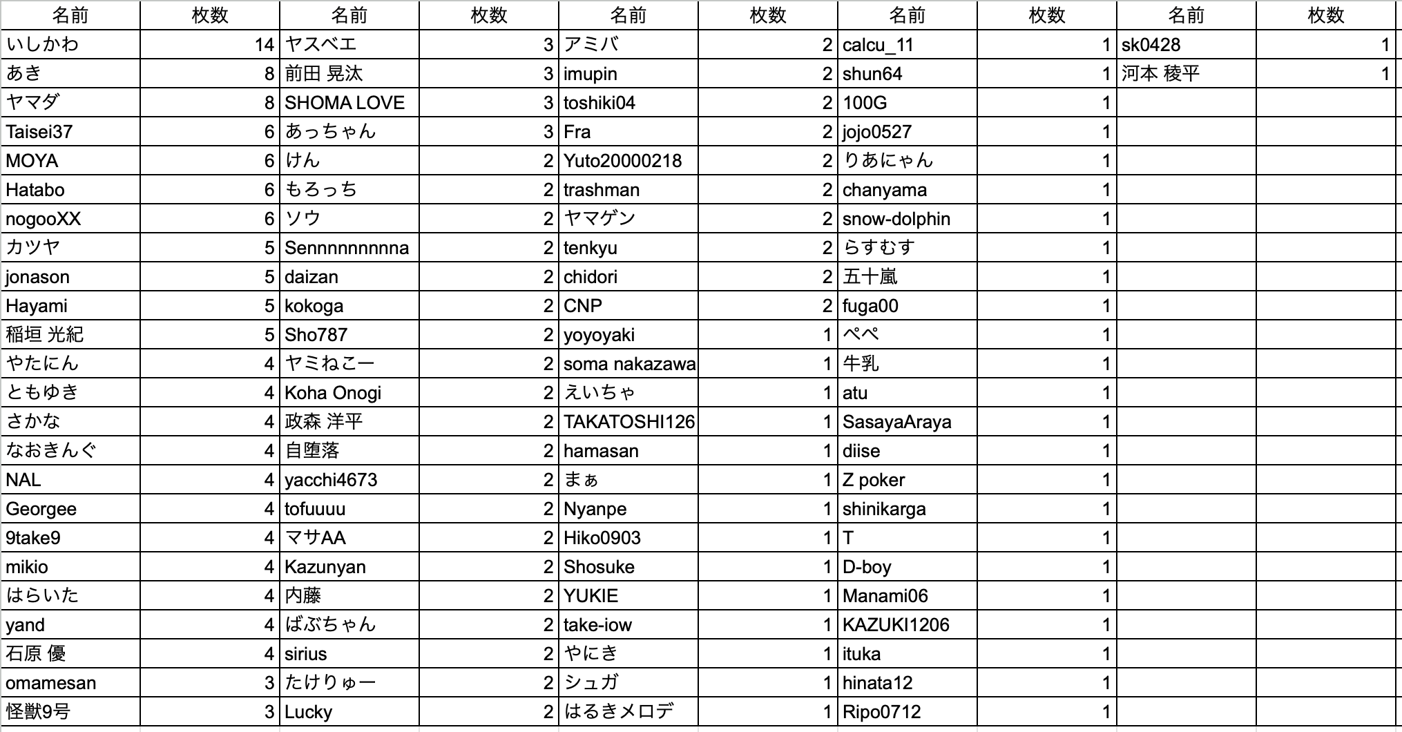 集計期間中にGameIDのニックネームを変更された方は、名前が2つに分かれてしまいますのでご了承ください。